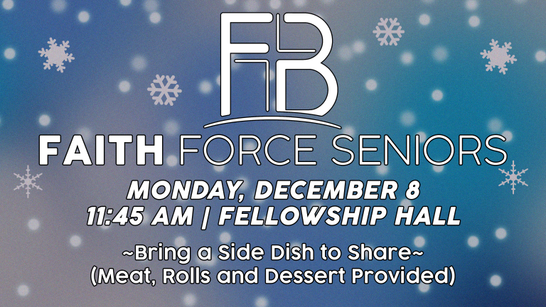 Faith Force Seniors will be having a Christmas Potluck on December 8th. The special day will include Christmas music from the Homeschool Choirs, fellowship and a time of singing Christmas Carols together after the meal. Bring a side dish or two of potatoes, vegetables or a salad. Meat, rolls and dessert provided.