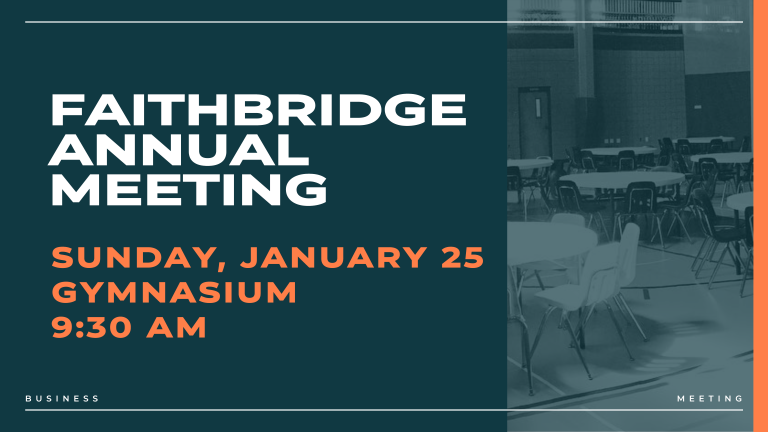 Faithbridge Annual Meeting is Sunday, January 25th in the Gym during the Faith Class hour. Members and regular attenders are encouraged to attend. Youth Faith Classes will still meet, but all Adult Classes are cancelled.